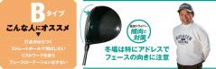最近のドライバーヘッドは空気抵抗の軽減を狙った「空力ヘッド」が増えています。そういったヘッドは、確かにダウンスイング後半からインパクトにかけてヘッドがスムーズに振り抜ける感じがしますが。その反面、ヘッドを硬い地面に「ポン」と置いたときに、フェースが開いて右を向く傾向があります。芝が薄くなる冬場はフェース向きに注意してアドレスしましょう。