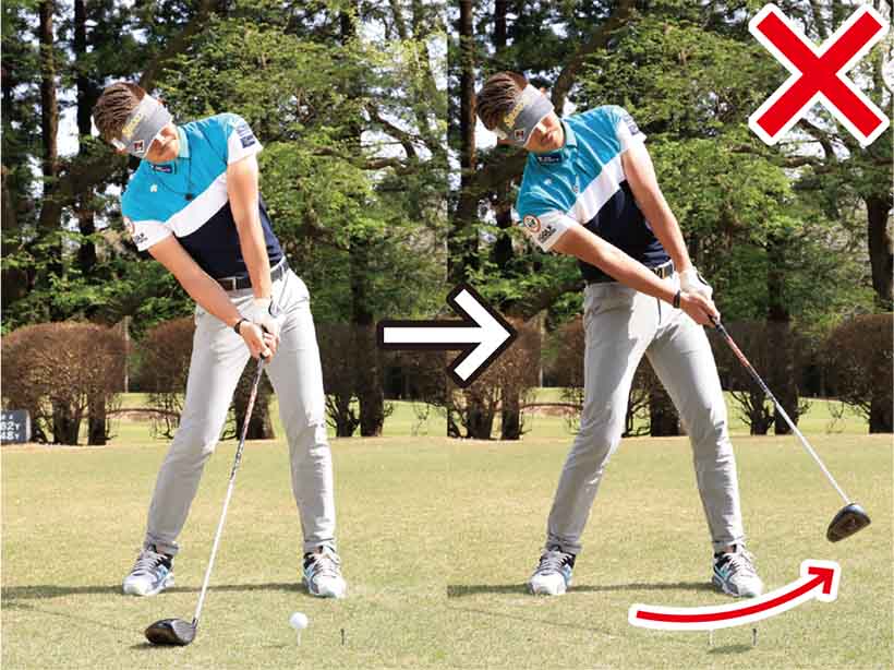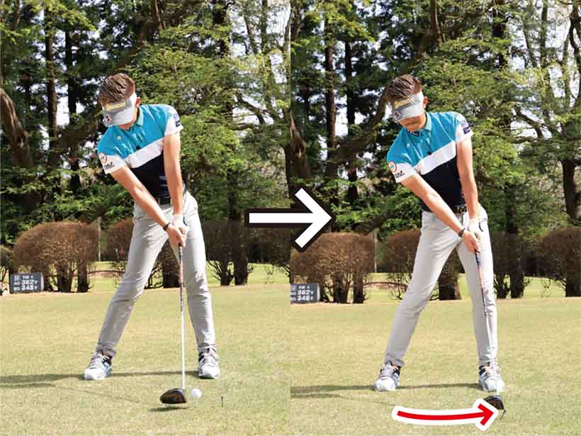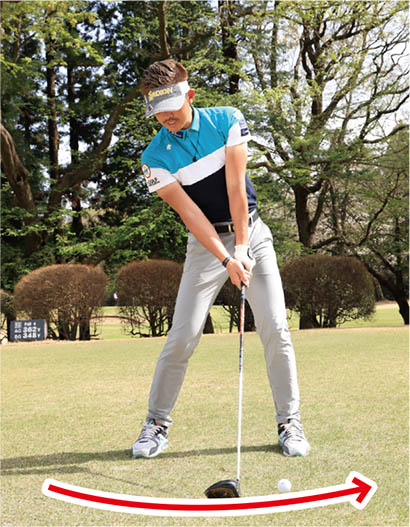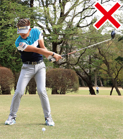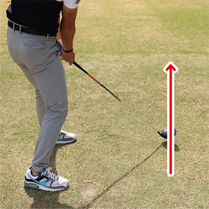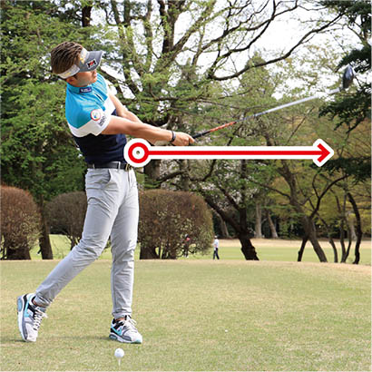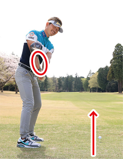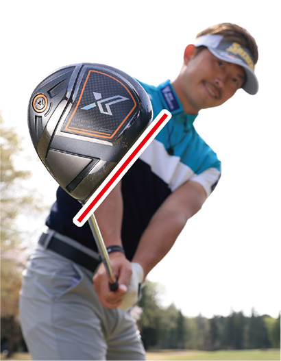 初心者の多くはボールをすくい上げようとしてフォロースルーで腕が縮んでしまいます。ティアップしたボールを打つドライバーショットの場合、ボールをアッパーブローにとらえますが、上げようとしてアッパー軌道になりすぎてはダメ。ボールの先のティにも当たるように真っすぐ振り抜くイメージを持ちましょう。ヘッドをストレートに出せるようになり、インパクトのフェース向きやクラブの入射角が安定します。長いインパクトゾーンが作られて、出球の方向も安定してくるんです。