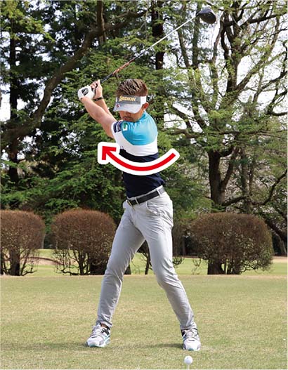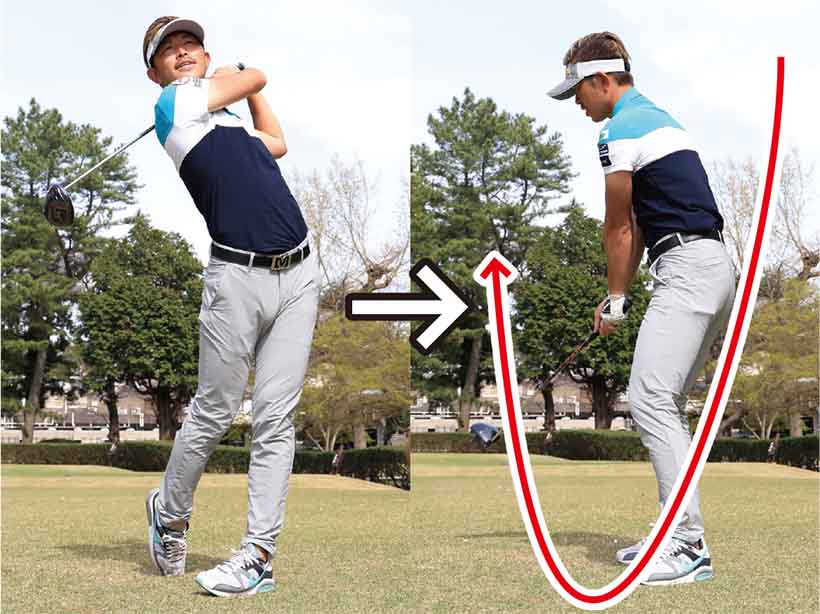 ・シャフトが背中や首の後ろに振れるくらいまで振り抜く