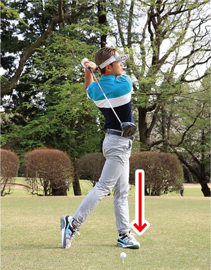 そしてダウンスイングではお腹を目標方向に向けるイメージでフォロースルー、フィニッシュへと向かってカラダを回転します。そうすれば下半身もしっかりついてきて、正しい回転運動ができるようになります。「バックスイングで体重を右足に乗せて、ダウンスイング以降は体重を左足に乗せる」とか「ダウンスイングでは左足を踏み込んでからカラダを回す」などといいますが、両足の動きを意識するとスイングが難しくなるんです。それよりもカラダの中心部であるお腹を重心と考えて頂きたいのです。