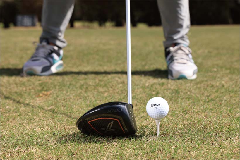 ドライバーの場合、ボールの位置は左カカト内側の延長線上が基本です。そして上体を少し右に傾けて、頭とボールが真っすぐ向き合うような姿勢を作りましょう。時計盤でいえば頭は11時、ボールは5時の位置となります。これはティアップしたボールを自然とアッパーブローにとらえやすくするためです。