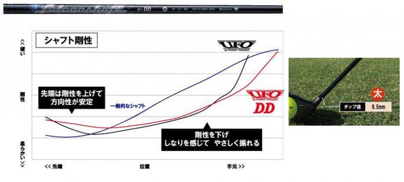 一般的なドライバーシャフトより太いチップ径9.5㎜を採用。先端部の剛性を上げ、ブレを抑え、スイングのパワーを強いインパクトに変えてくれる。シャフト全体の剛性バランスを最適化することで、短尺・先端高剛性でもシャフトの挙動が感じられ、タイミングが取りやすくなっている。