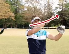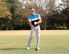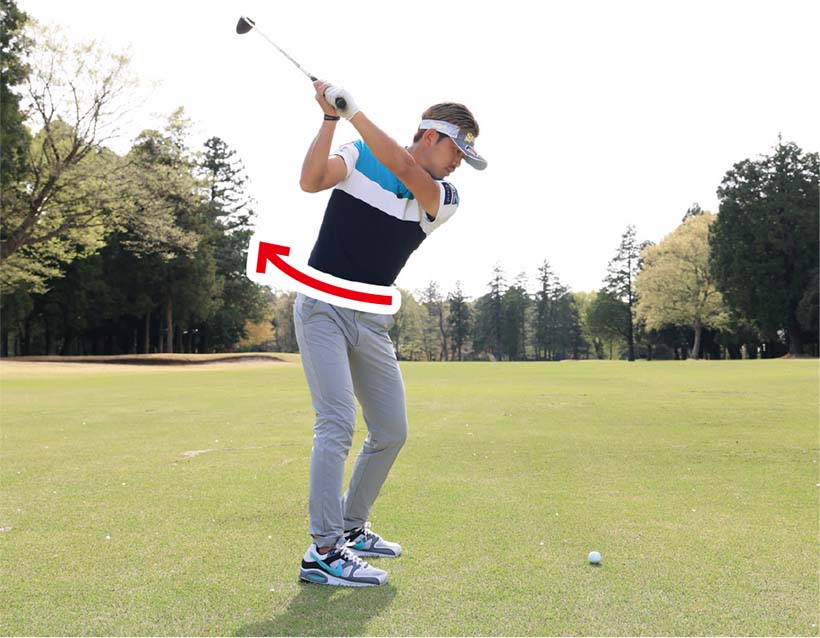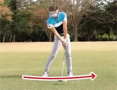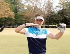 打ち方のポイントとしては、手や腕の動き、肩の回転、足の動きなどはあまり考えないで、「お腹の回転」を意識することです。バックスイングではお腹を右に90度くらい回しながらクラブを上げていき、左肩をアゴにつけるイメージでトップの位置へ導きます。そしてダウンスイングではお腹を目標方向に向けるイメージでフォロースルー、フィニッシュへと向かってカラダを回転しましょう。結果的に下半身もしっかりついてきて、正しい回転運動ができるようになります。お腹の回転を意識するだけで上と下の動きのバランスが整い、スイングがとてもシンプルになります。