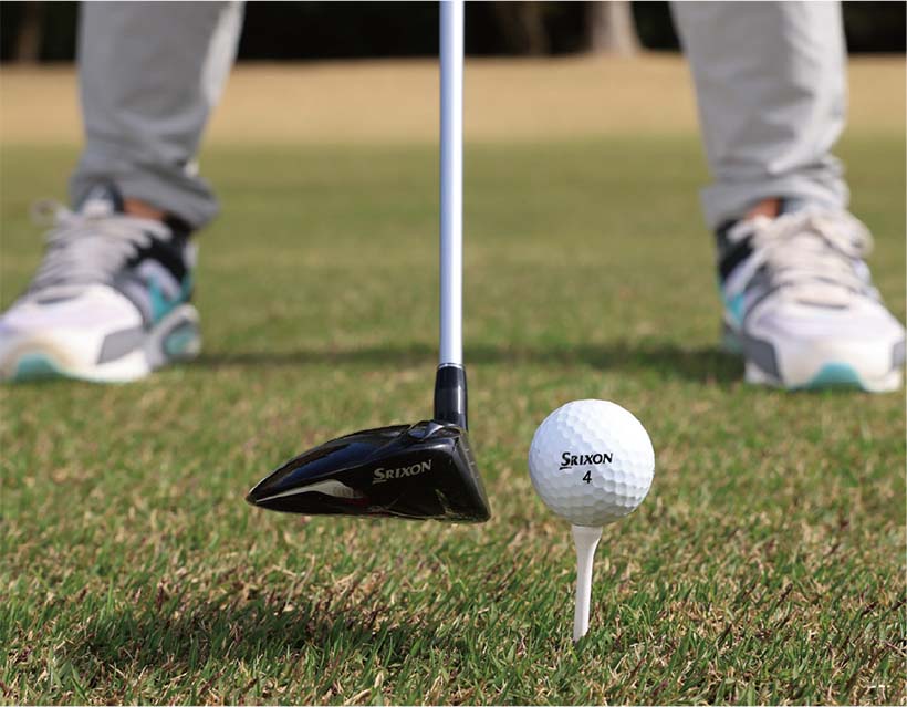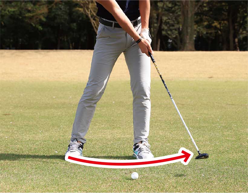 飛行機の着陸のように緩やかな角度から下降し、滑走路の上を少しだけ真っすぐ走り、そこから飛行機の離陸のように緩やかな角度で上昇していくというイメージです。フェアウェイウッドはアイアンと違ってソールが幅広く造られています。このソールの部分を芝の上で滑らせるのです。フェース面をボールに当てるよりも、ソールを使って打つ意識を持つのがいいと思います。落ち葉をホウキで掃くような感覚のスイングというわけです。ショット前の素振りでも腰くらいの高さのスイングで、ソールで芝を軽くこする素振りを数回繰り返し、ソールを使って打つ感覚をチェックしましょう。