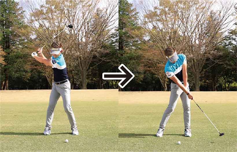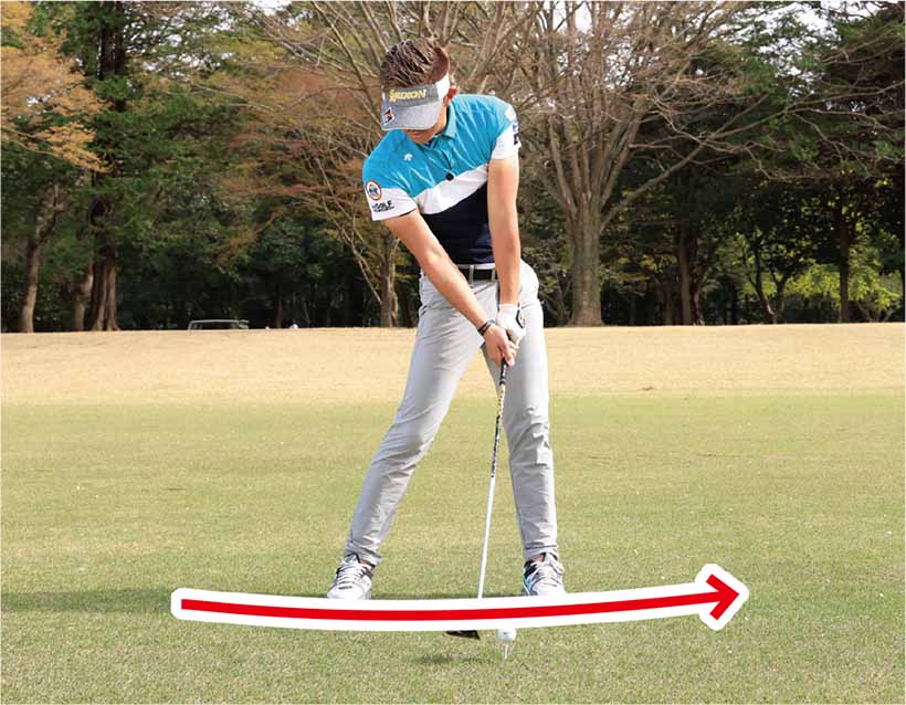 初心者の多くは「ボールにちゃんと当たらない」と嘆きますが、これはインパクトで上体が起きてしまうのが一番の原因。アドレスでお腹を引き締めていても、インパクトでお腹が緩むと腰が前に出て、上体が起きてしまいます。そうなるとダウンスイングの軌道を大きく狂わせてしまい、クラブヘッドが正しい位置に戻ってこないのです。アドレスの前傾角度をインパクトで再現することがグッドショットの絶対条件。お腹にグッと力を溜めておくことでアドレスの前傾角度をキープしやすく、ミート率がアップするのです。両手で重いものを抱え持つような姿勢を作り、お腹を左右に回して正しい回転のイメージをつかんでください。