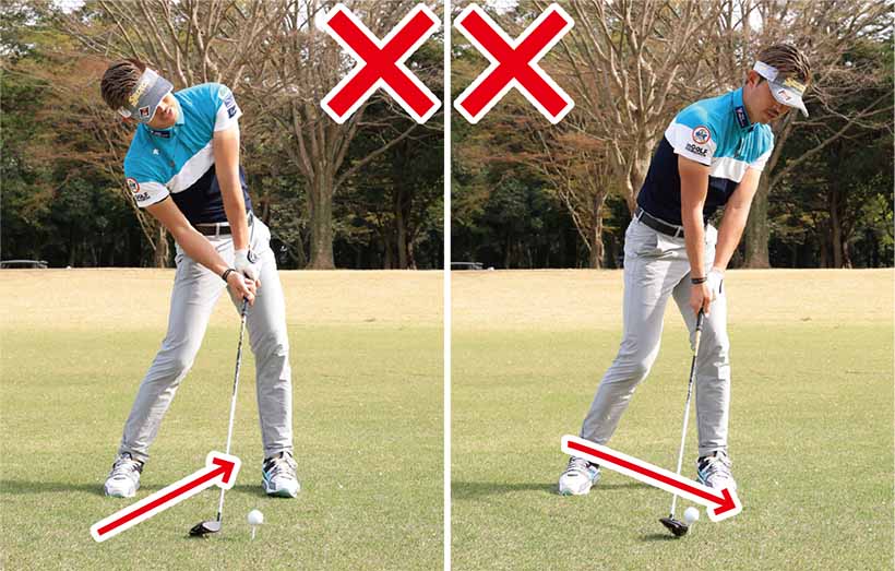フェアウェイウッドの打ち方の基本として、ボールを横から払うのがいいのか、それともアイアンのように上から打ち込むのがいいのかという質問をよく受けますが、ボクはボールを横から払い打つイメージでスイングするのがいいと思います。上から鋭角に打ち込むとインパクトが詰まってクラブがスムーズに振り抜けないからです。かといってボールをすくい上げる動きもNGです。クラブヘッドを鈍角な軌道で振り下ろし、ボールの少し手前からクラブヘッドのソールを滑らせて、低く真っすぐ振り抜いていくようにスイングするのがコツです。