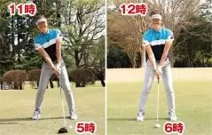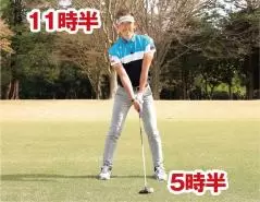 ボールをティアップして打つドライバーは左カカト内側の延長線上にセットし、7番アイアンはスタンスの中央付近にセットするのが基本です。フェアウェイウッドのボールの位置はドライバーと7番アイアンの中間となります。時計盤にたとえればドライバーの場合は頭が11時でボールは5時、7番アイアンは頭が12時、ボールは6時というイメージ。そしてフェアウェイウッドは頭が11時半、ボールは5時半となります。つまり顔とボールが真っすぐ向き合うような構えを作るのです。