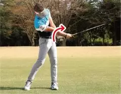 両手を離してクラブを持つ練習をスプリットハンドドリルといって、プロたちも実践しています。これはグリップエンドを支点にして自然なローテーションを入れる感覚のマスターに大きな効果あります。ホウキで落ち葉を払うような腕使いが身につき、ソールの滑りをうまく利用して打てるようになります。フォロースルーで左ヒジが引けるためにスムーズに振り抜けない人にも、スイング修正法として役立ちます。