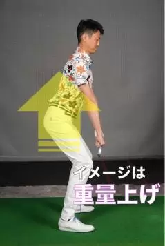 重量挙げのように、その場で重い物を持ち上げるイメージをもつ。こうすると下半身がどっしりする。また、絶対猫背にならず背すじが適度に伸びる。