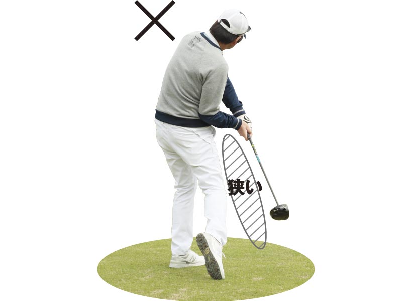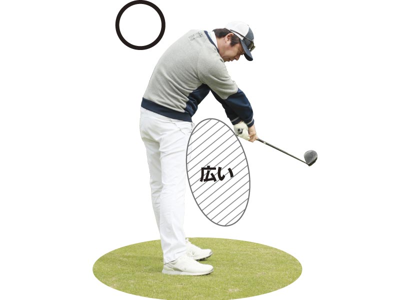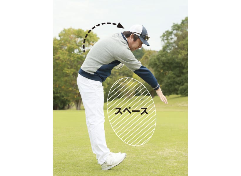 腕がカラダに近いほうが良いと言われた時代もあったが、飛距離ではマイナスに働きやすい。ふところのスペースが最大になるように、みぞおちを丸めながらインパクトする。
