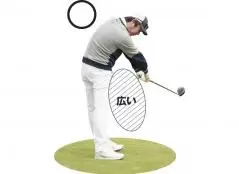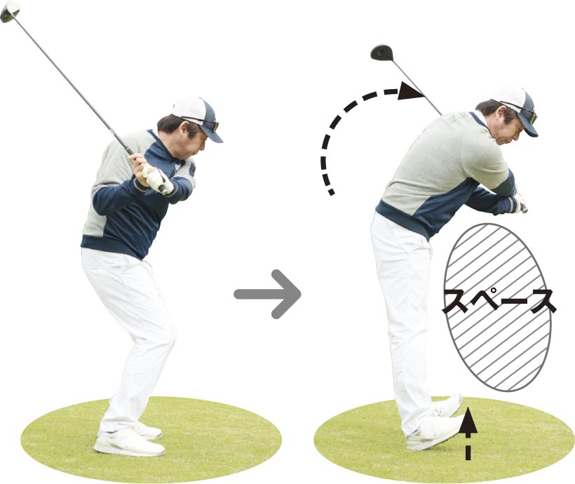 それを行うコツは、ダウンスイングでみぞおちを丸めるように使って、ふところに大きなスペース(空間)を作るように振ることです。自然とカラダの開きが抑制でき、胸を下に向けたまま、ヘッドが走るのが感じられます。