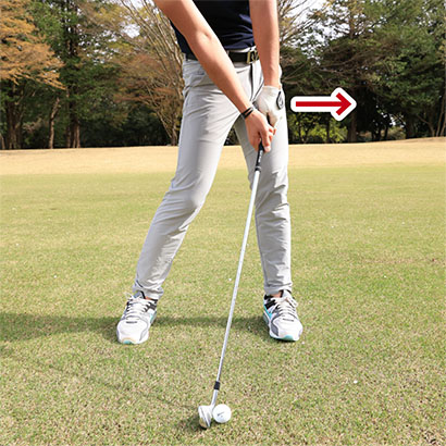アドレスするときは、左足太もも内側の前にグリップをセットして、少しハンドファーストになるようにしましょう。