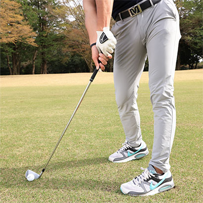 (5)軽いハンドファーストになるようにグリップ位置を左足太もも内側の前にセットします。