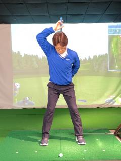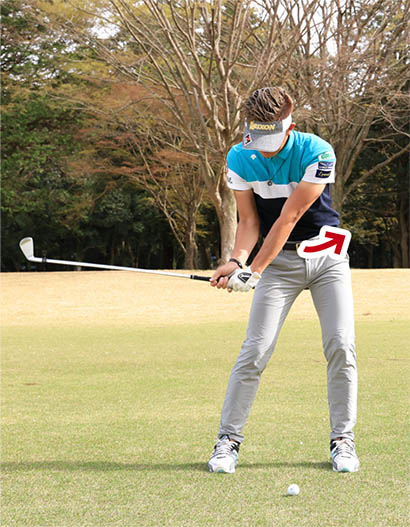 (2)切り返しは左膝をアドレスの位置へ戻すなど、下半身リードで行います。