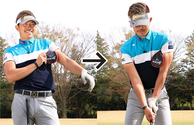 (2)両脇を軽く締めて体の正面でクラブを持ちます。