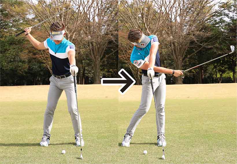 これを防ぐには、切り返すときに右肘を右のお尻のポケット方向へ下ろす意識をもちましょう。さらに胸が右を向いたままクラブを下ろすイメージをもつと、アウトサイド・イン軌道が抑制されると思います。