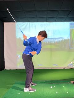 (3)左股関節で体を回転させて、回転と連動・同調するように腕とクラブを振ります。