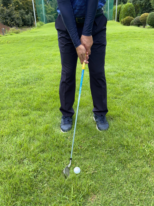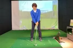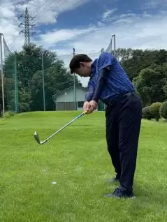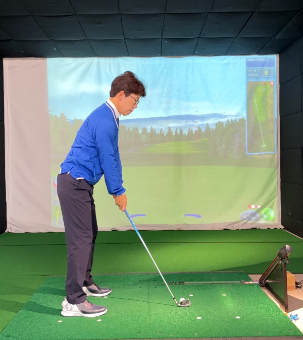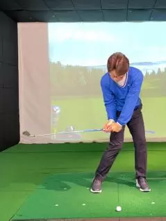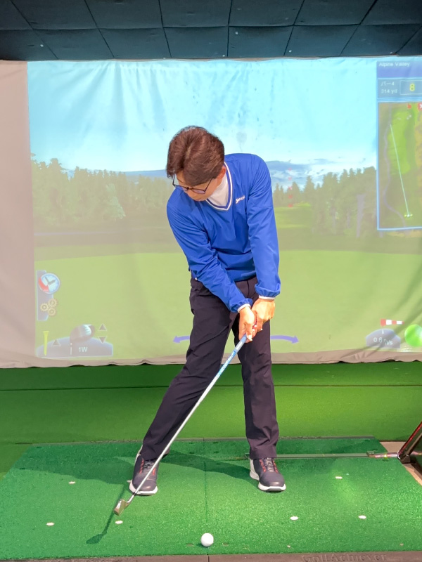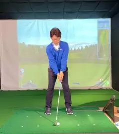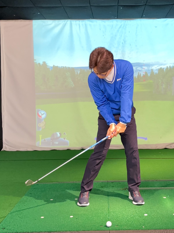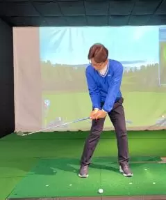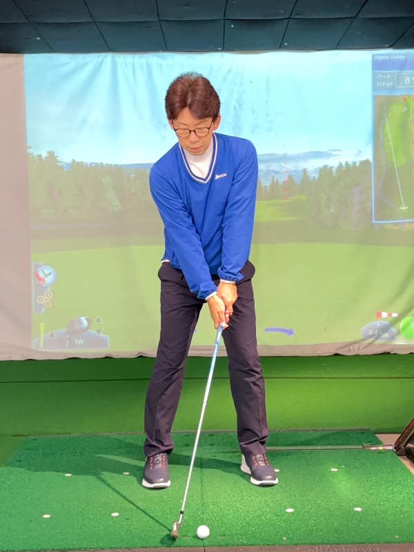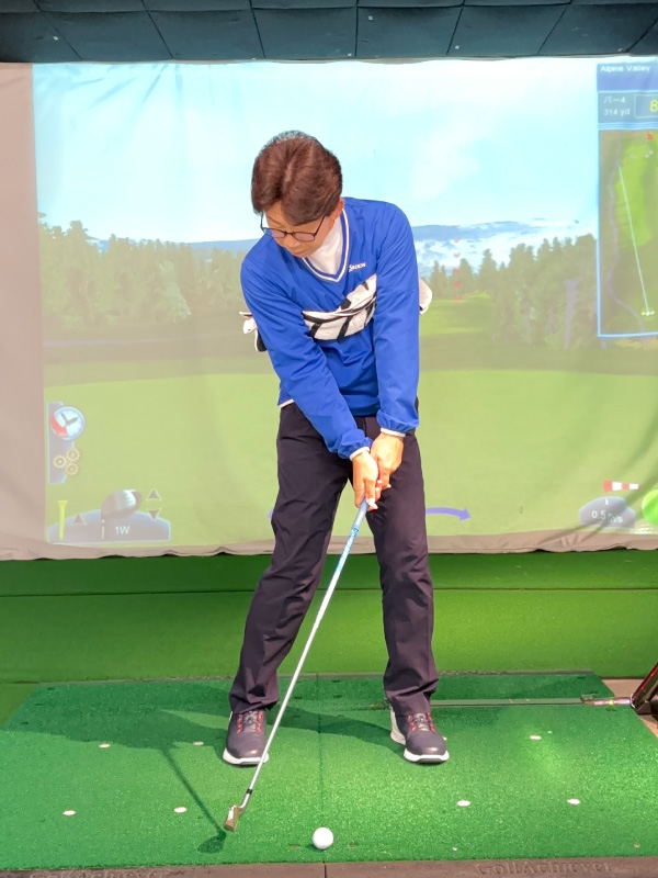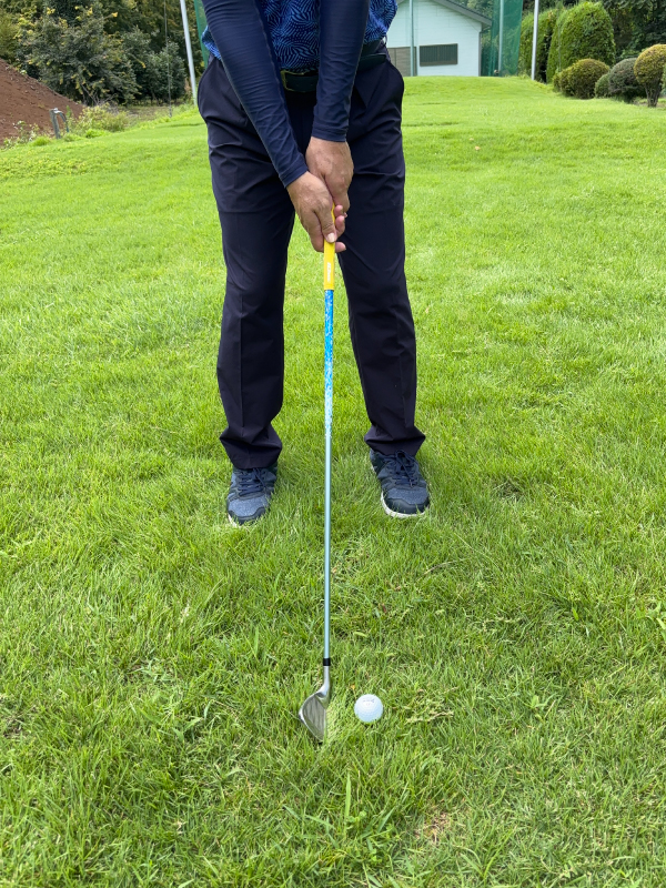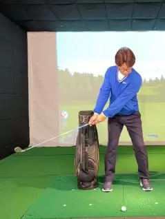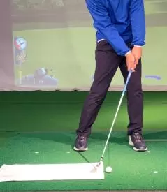 (5)軽いハンドファーストになるようにグリップ位置を左足太もも内側の前にセットします。