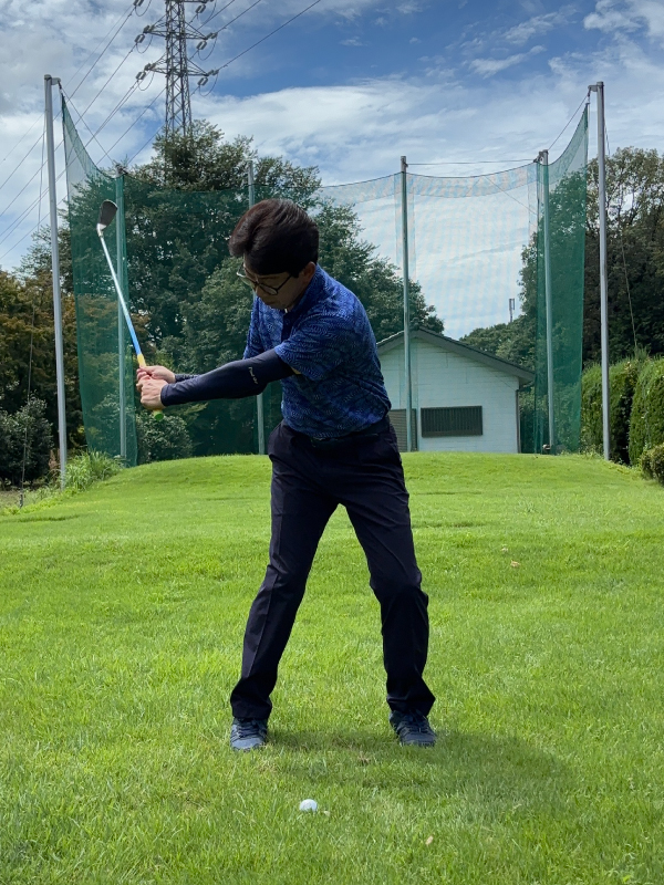 体の右横にキャディバッグを置いて、それに体がぶつからないように気をつけながらボールを打ちましょう。