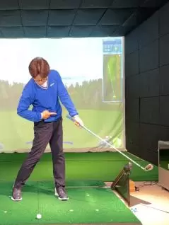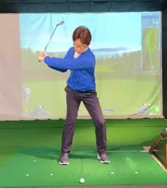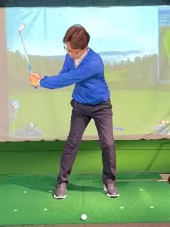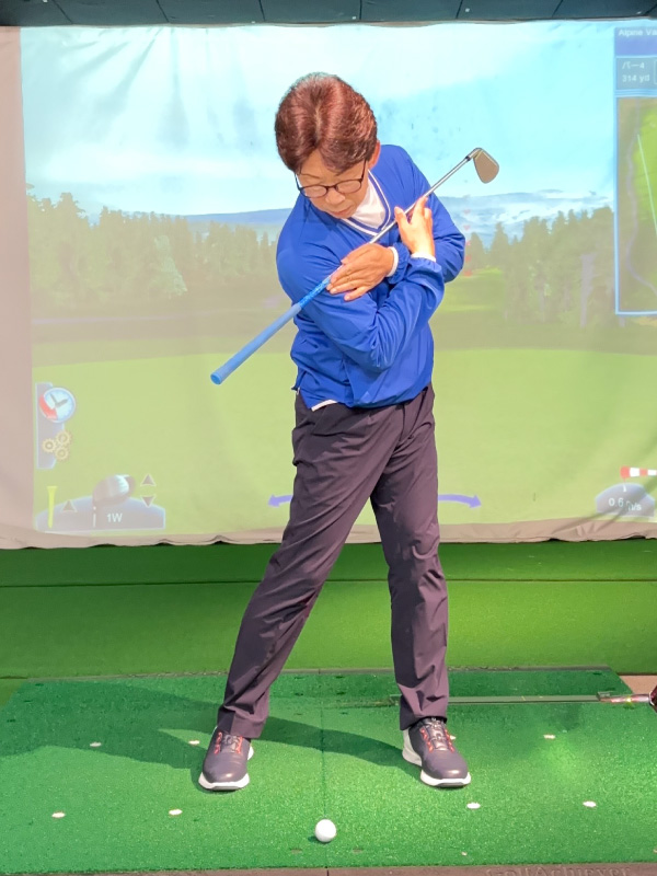 (3)左股関節で体を回転させて、回転と連動・同調するように腕とクラブを振ります。
