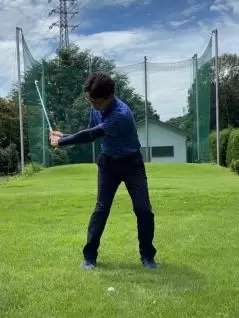 キャディバッグに体がぶつからないようにバックスイングしましょう