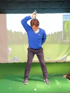 これを防ぐには、切り返すときに右肘を右のお尻のポケット方向へ下ろす意識をもちましょう。さらに胸が右を向いたままクラブを下ろすイメージをもつと、アウトサイド・イン軌道が抑制されると思います。