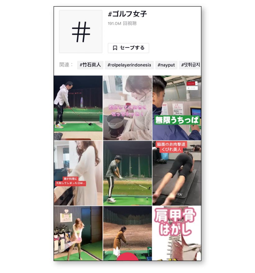 「#ゴルフ女子」でも多くの動画がヒットする。それぞれの動画を閲覧してみると、ゴルフプレーの楽しさだけでなく、ファッション、仲間との交流など、ゴルフに付随する楽しさも表現。中にはゴルフ場で撮影した「TikTok」ならではのパラパラ動画まである。