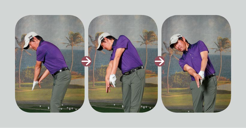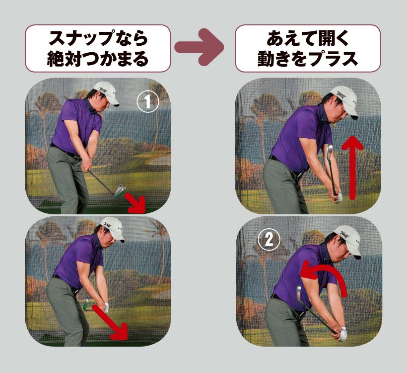 スナップ動作なら、フェース面はインパクトエリアでほぼボールに向いたままになります。逆に、それがつかまりすぎのフックのミスを誘発しやすい」(森)