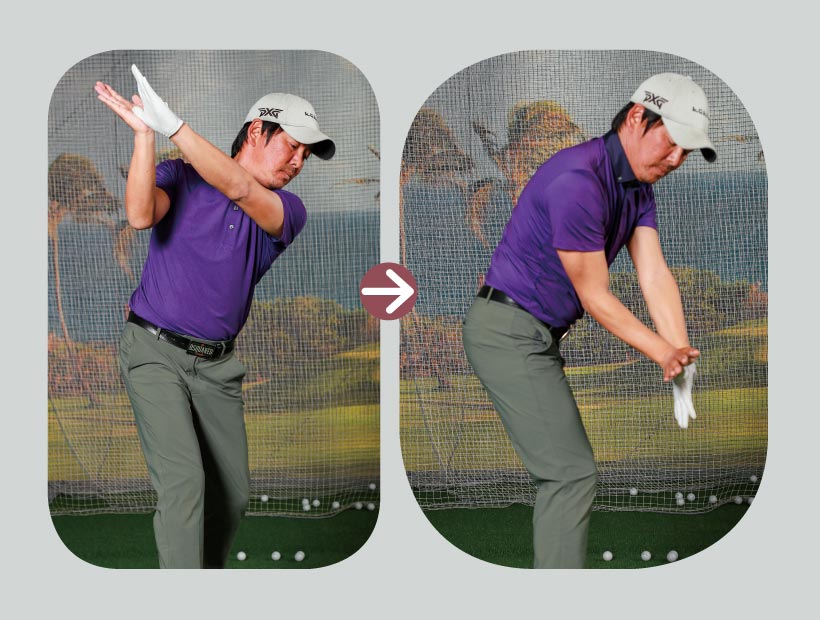 「フェースのトゥ上を後ろに寝かすように振り上げる。すると、ヘッド重心がシャフトの軌道にすんなり乗っかって、スパッとトップまで振り上げられます。その勢いにまかせて“カッピング”で深いトップに入れば、スムーズにダウンに移行できます」(森)