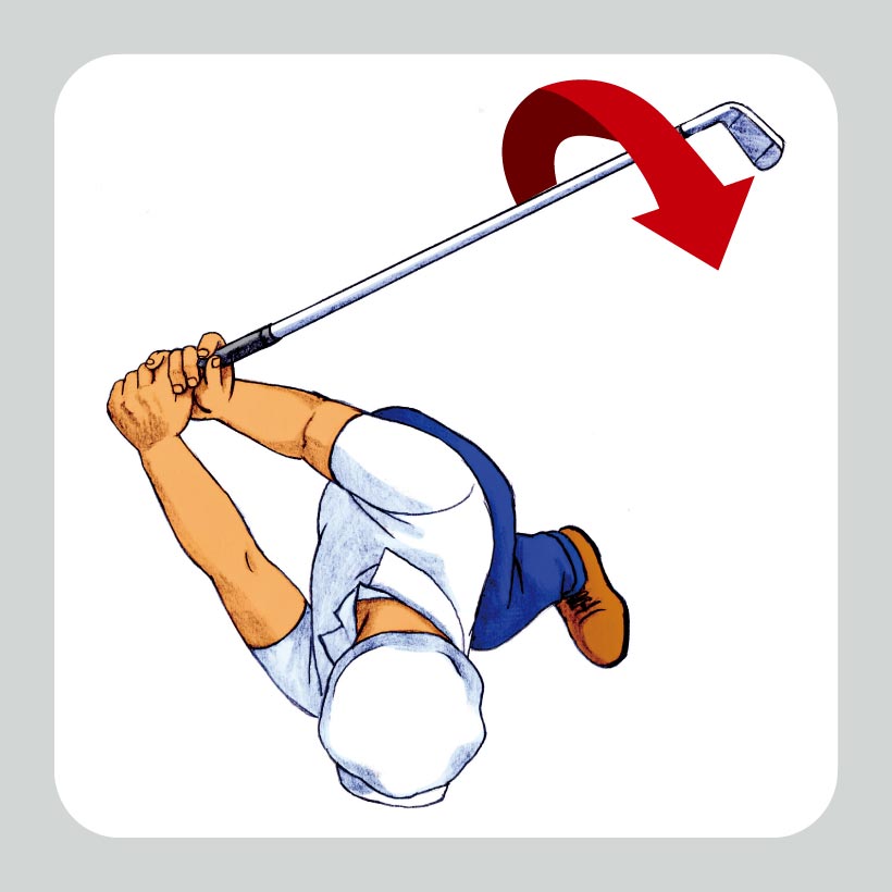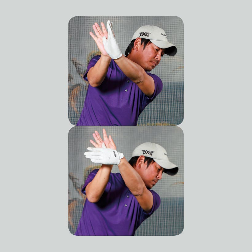 右手のヒラは常にヘッド軌道に向いたまま。左手は左腕のローリングに合わせて向きを変えていく。左手でグリップをたぐることで、右手のスナップ動作が促される。