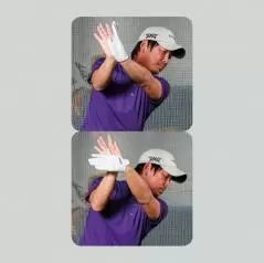 「左手首の“カッピング”(上)は、フィル・ミケルソンのような深いタメと効率の良い長打を生み出します。一方“掌屈”(下)は、安定性は高めても飛距離アップにはつながりません。左手首を傷める危険性もあります」(森)