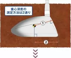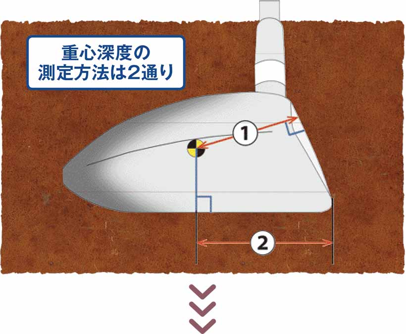 ヘッド重心からフェースまでの垂線の長さが「重心深度」。これは全クラブ共通だが、アイアン以外ではリーディングエッジからソールに沿って重心までの距離を測る場合もある。