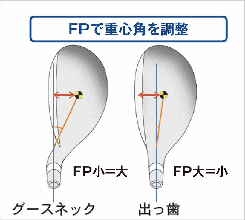 となると、逆に重心の深さ=重心角の大きさ=つかまり具合とシンプルに捉えることができる。数年前までは打球の低スピン化で飛距離アップを目指すための浅重心設計が人気になることもあったが、極端なつかまりの悪さからフェードアウト。現在は適正なつかまりを生む、浅すぎず深すぎない重心設計が求められている。ちなみに、重心深度の数値はフェースと重心の距離で表されているが、重心角はFP(フェースプログレッション)も大きく影響する。オンセットのウッドとは異なり、オフセット(グースネック)のアイアンやUTはシャフト軸線からの重心の深さをチェックする必要がある。