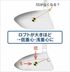 現在、ウッドヘッドは460㎤、ヘッドMOIは5900g・㎠までにルールで規制されるようになっているが、数値の上限に近づくほどネック軸回りMOIも大きくなりがちだ。すると、フェース向きが戻り切らずつかまりが悪くなる。つかまりを良くする手法としては重心距離を短くしてネック軸回りMOIを下げるか、重心深度を深くして重心角を大きくするのが基本。