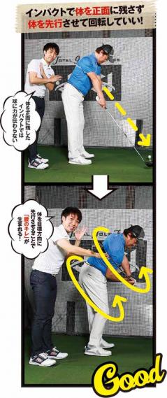 写真 下)体を目標方向に先行させることで「腰のキレ」が生まれる!