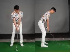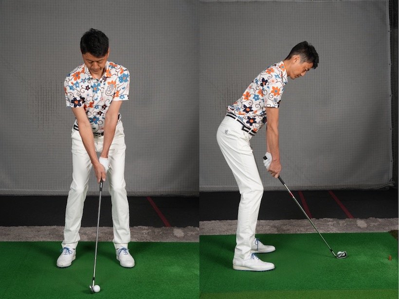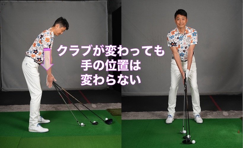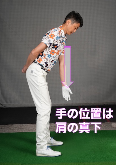 両手を真下にダランと垂らす。全番手、垂らした位置でクラブを持つ。