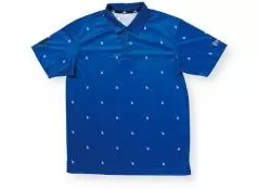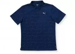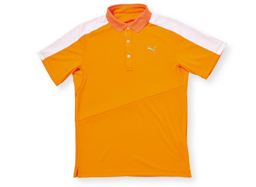 よく見ると、PUMAのグラフィックが全面にプリントされたポロ。ストレッチ性の高い生地で、ストレスなくプレーに集中できる。スイング時の横のブレを支える最新スパイクレスシューズと快適プレーを