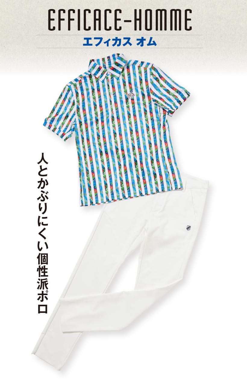 エフィカスオムのポロシャツは多彩な柄で展開、追加生産もしないので、「人とかぶった!」という事態を回避できるのが魅力。生地の裏側はメッシュ状で、通気性や速乾性が抜群。