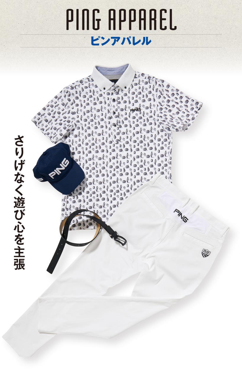 サボテンやクラブ、キャディバッグなど遊び心ある総柄プリントの鹿の子ポロ。モノトーンの控えめな色使いながら、存在感は絶大。黒のベルトがコーディネートの引き締め役に。