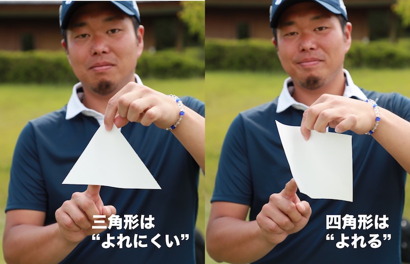 「同サイズの三角形と四角形の紙片の端を押すと、三角形は四角形のように“よれないんです”。この紙片をフェースに見立てて考えていただければ、トラス構造がもたらすメリットがよくわかるのではないでしょうか」(黒宮)