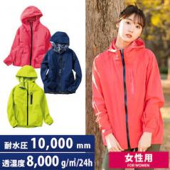 耐水圧10,000mmの高機能を誇るレディース向けのレインジャケット(上のみ)です。全方向ストレッチ素材と、脇部分のアクティブカット採用で、動きやすさも十分に確保。軽量性も備えて、まさにゴルフに最適なレインウェアです。