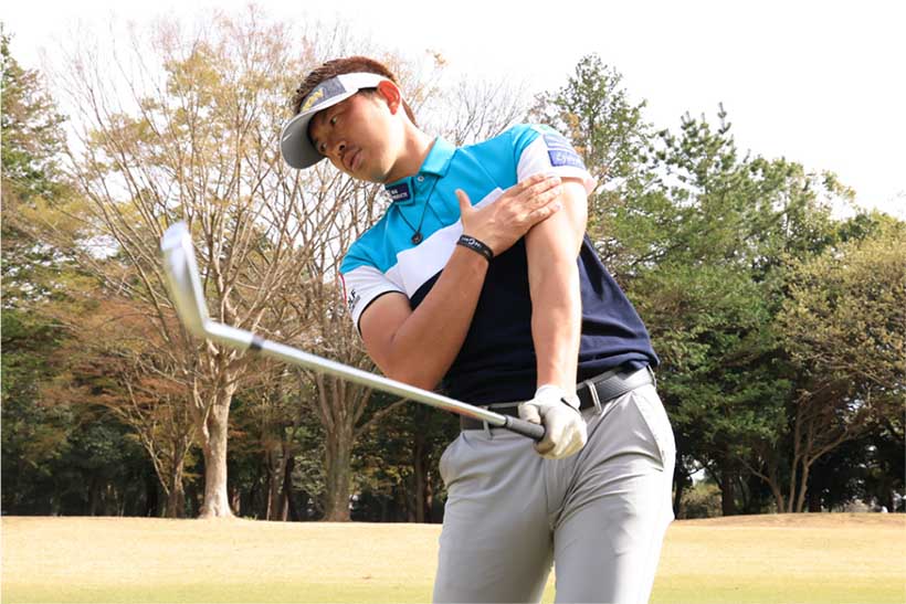 パワフルなハンドファーストインパクトを作るには、左ワキを締めて左手の甲を目標に向けるイメージでボールを打つのがコツ。左手甲とフェース面をリンクさせてインパクトするという感覚です。ボールを上げようとするとインパクトで左ワキがあいて、左手甲が上を向きやすいですから、左手甲を斜め下に向けるイメージでもいいくらいです。そして右ヒジは右ワキ腹に軽くつけた状態で少し曲げておき、右ヒジと右腰を同調させてボールを目標方向に押し込んでいくイメージでフォロースルーへと振り抜きましょう。