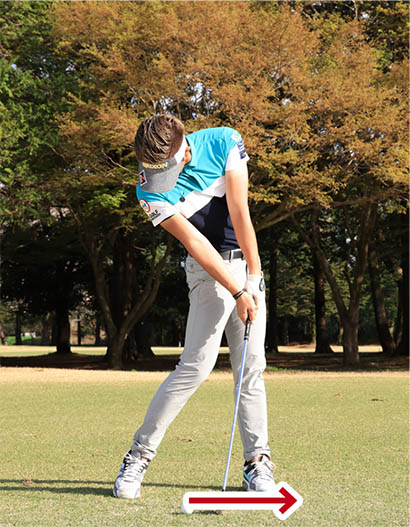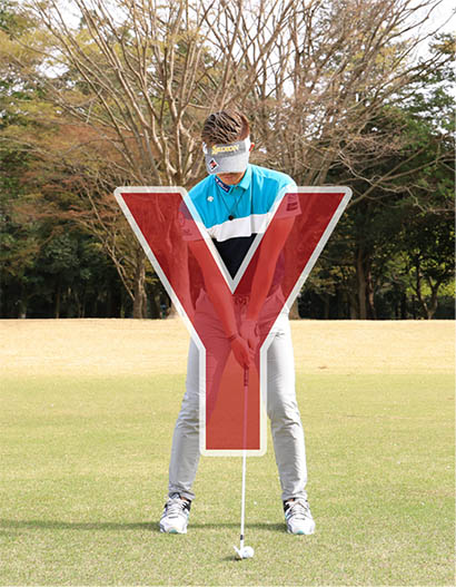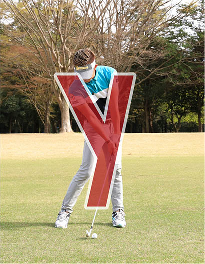 すくい打ちになって飛ばない人はロフトが増えてしまうようなインパクトになっています。アドレスでは体重を左右均等に乗せて、両腕とクラブが大文字のY字に見える姿勢で構えるのが基本。そしてインパクトでは体重の7割近くが左足に乗り、カラダの回転と連動して両手が左モモの前に移動します。両腕とクラブは小文字のy字に見えるハンドファーストの形が作られます。