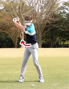 ・左ヒジとお腹を一緒に回してフォロースルー