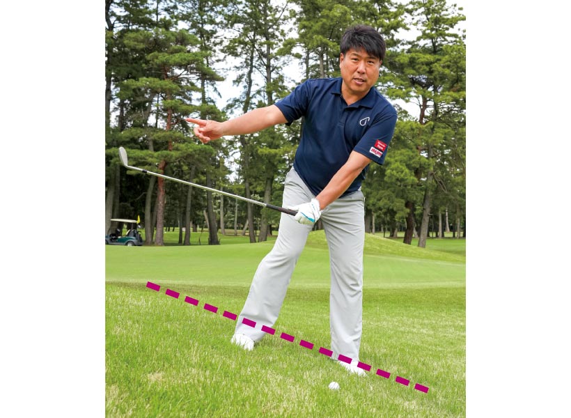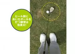 この構えを作ったら、フェースセンターではなくて、少しトゥ側に当てたほうが打ちやすい。ラフからは、どうしてもスピンがかかりにくいので、飛びすぎてしまうこともありますが、トゥ側に当てることで初速を抑えることができるので、飛びすぎるミスが出ません。