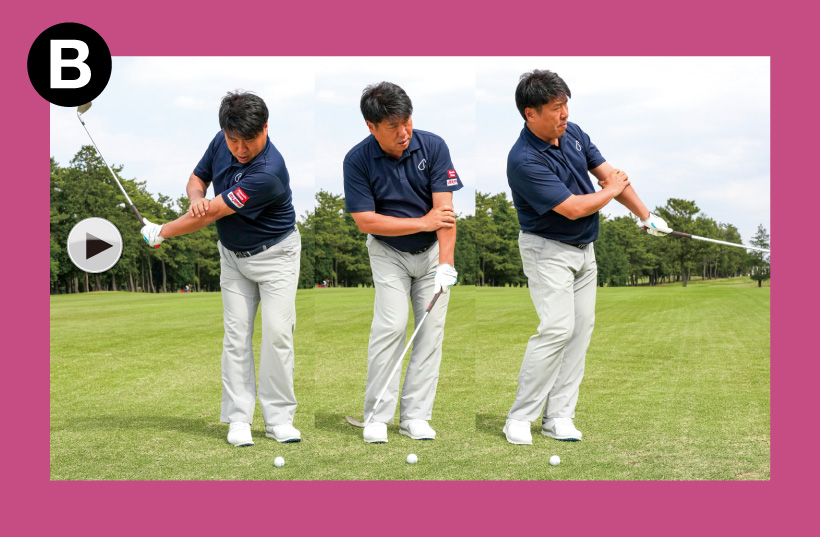 B 左ヒジをつかんだまま片手打ち!