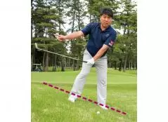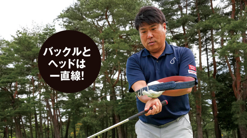体で打つためのポイントになるのが左サイドの使い方です。まず、最も大事なのが左手首の角度。アドレスしたときの左手首の角度は絶対に変えてはいけません。手首の角度を変えないために感覚的にはノーコックで打つイメージでOK。もちろん、アプローチでも多少のコックは入りますが、意識的にコッキングしてしまうと手首の角度が変わってしまいます。左手首からつながった部分として、左腕も伸ばしたまま打ってください。左ヒジが曲がってしまうのは絶対にダメ。左腕が「1本の棒になった」感覚で打つと体が回るようになります。