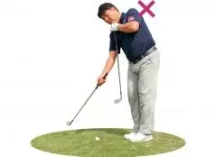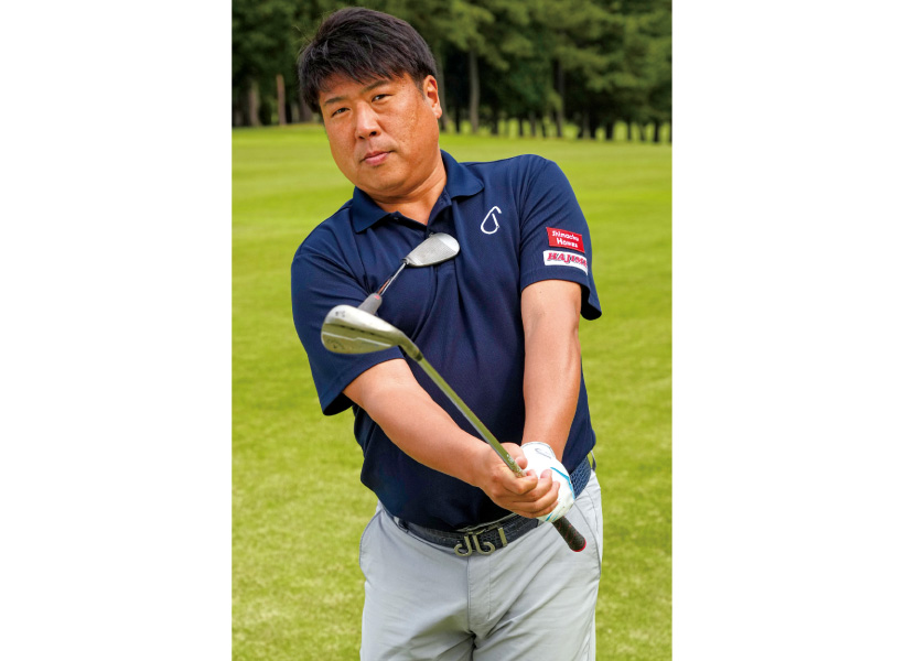 アマチュアの皆さんだと、アドレスしたときに手首がアゴの前に出たり、インパクトの瞬間に手首がアゴの下を通るタイプが多いですが、アドレスからフォローまでアゴより前に手を出さないこと。グリップエンドが体にくっついてしまうくらいの距離感で打てると、絶対に手打ちにはなりません。