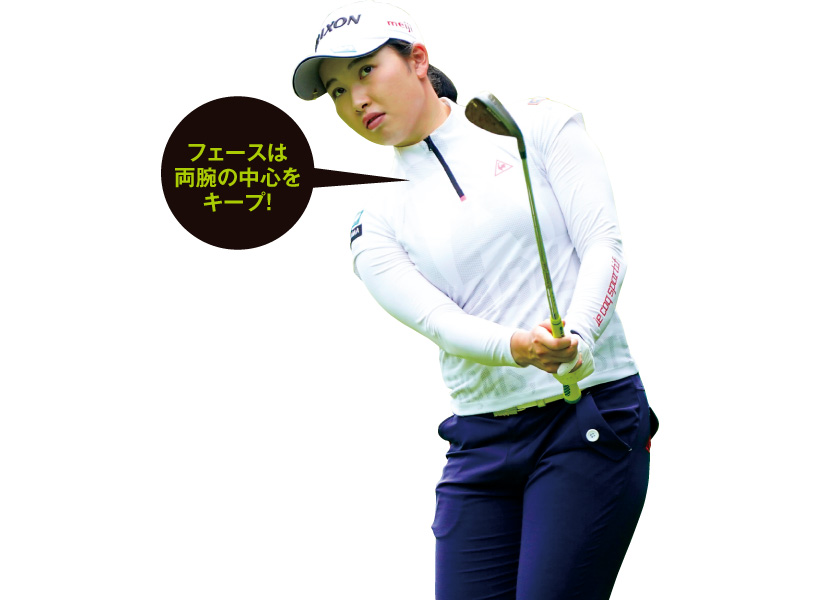 私が小祝さくらに教えてきたのは、自分から見えているフェース面の角度を変えずに打つこと。フェースが閉じたり、開いたりしないように打つことではじめて体の回転で距離感を出せます。さらにフェースにボールが乗るのでスピンも入りやすいです。
