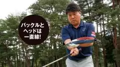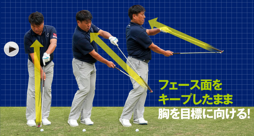 手で距離感を出さないポイントは2つあります。まず、フォローでは体の中心にヘッドが来ていること。もう1つは、そのときのフェース面が自分を向いていることです。フェースを返してしまう人はフェース面が見えない角度になっていますが、それこそが「手打ちの距離感」です。フェースを返してしまうと、結局はリストターンで距離感を調整することになります。